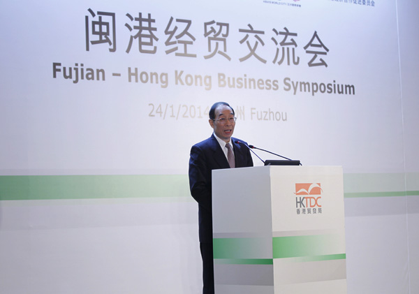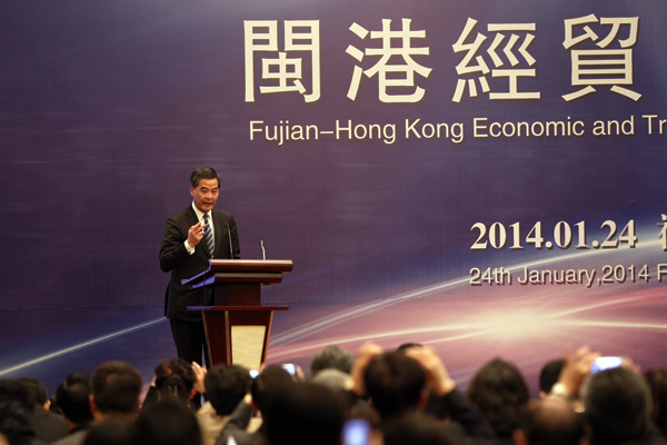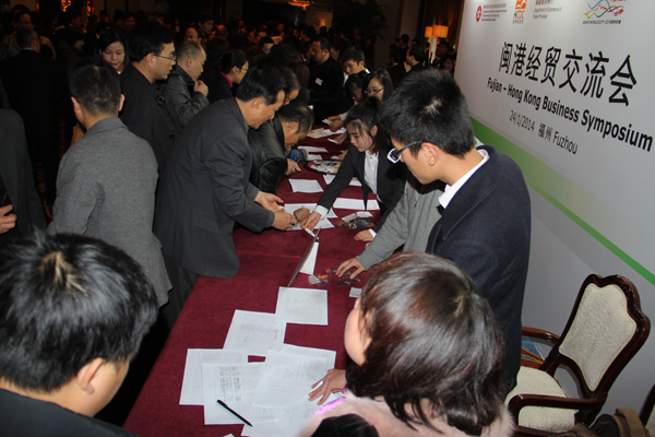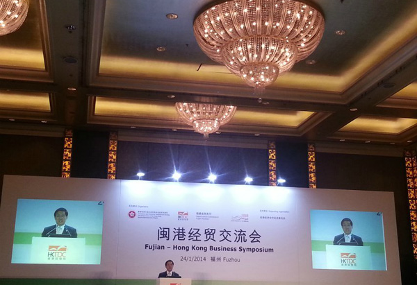 香港特区行政长官梁振英率领近100位香港经贸代表出席,与福建企业代表聚首一堂,共同探讨两地的合作机遇,并且向闽商推广香港服务业,以及介绍香港作为国际商贸平台的优势。会上,梁振英特别强调,非常欢迎内地企业合理利用香港公司进行投资、移民。