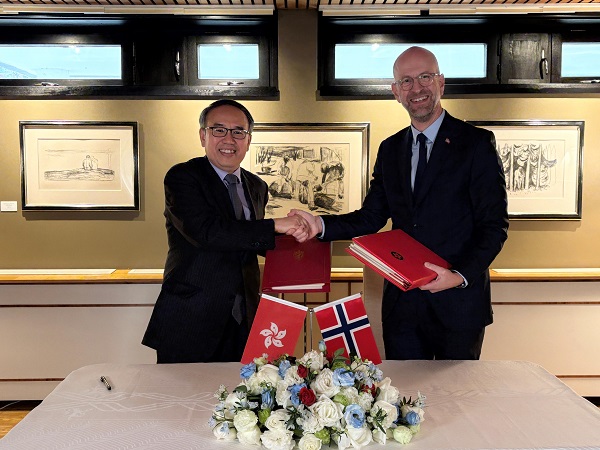 财经事务及库务局局长许正宇(左)和挪威驻华大使戴伟恩(右)今日(十二月十六日)在北京签署全面性避免双重课税协定后交换文件。(图源:香港税务局)