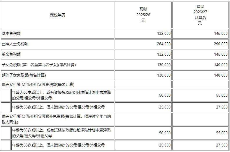 在2026-27年度财政预算案中,财政司司长建议以下措施:一次性宽减二○二五/二六课税年度税款;免税额的调整;长者住宿照…