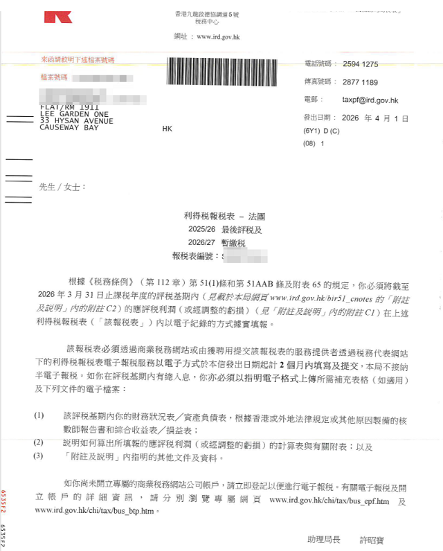 香港税务局已于2026年4月1日批量发出2025/26课税年度利得税报税表。我们注意到,许多客户同时收到税务局的通知信,明确要求自本年度起必须采用电子方式提交利得税报税表。